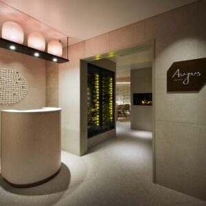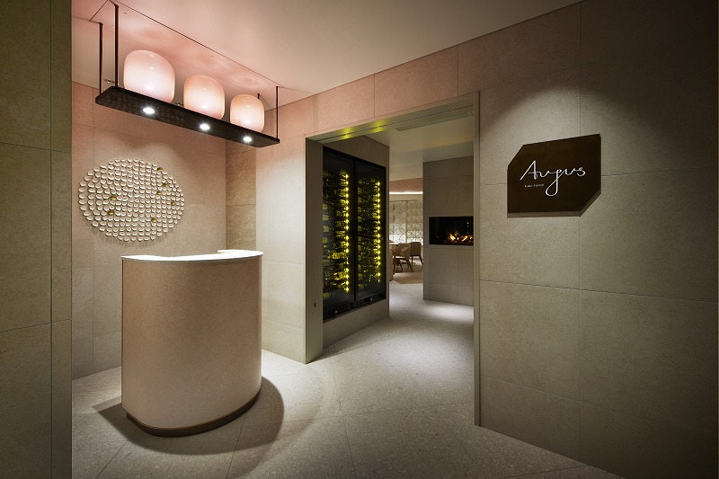 The restaurant's name, "Aujus (cherry blossom tree)," was used as a motif for the decorated screen that evokes cherry blossom petals floating on the surface of the Asuwa River and their overlapping, and the dining chairs and ceiling coloring are reminiscent of cherry blossom petals, creating a calm, modern space with one-tone colors wrapped in traditional Echizen Japanese paper.