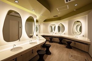 大浴場の浴室は舞子の浜にある「渚」をコンセプトとした。「渚」をイメージさせる浴槽形状とし、全体の壁色は海の色としてブルーを用い、また差し込む太陽光としてイエローのグラデションガラスを配しアクセントカラーとしている。外部にあたるドライエリアは既存の石垣を活かした庭として昔からの自然と内装のモダンに表現した自然を対比させた空間とした。また、SPA入口までの廊下は「渚」の水面模様を壁や床にも表現した。水面を描いた壁・天井をブルー系、もう一方の壁をベージュ系として入口コアの木目仕上げ空間に繋げている。脱衣ロッカー室はウッドフローリングと新緑をイメージしたカラーの天井クロス、ミラーも自然をモチーフとした有機的な形にし「木立」を抜けた先に「渚」が現れる連続性のある開放的な空間のSPAとしている。